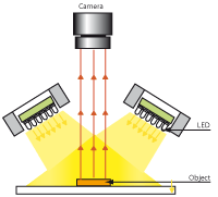 LEDs are arranged at a high-density on a single flat circuit board and the object can be illuminated from any angle desired. Suitable mounting brackets (15 mm width) are available.