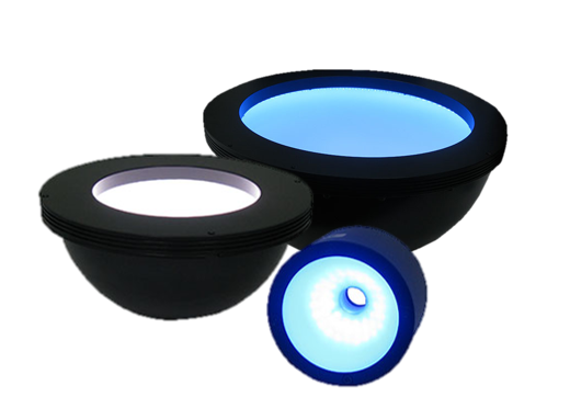 Light emitting area covers 180 degrees. This very bright diffused light enables shadowfree uniform light, perfectly suited for glossy or non-flat surface inspection. The small FLDM-i50 is cylindrical, and the others are dome-shaped. Dome lights are ideal for short working distances (0-30mm) to the workpiece. High power and UV versions are available for related applications. Rectangular shaped lights (FFDQ), half-dome and segmented models of the same features are available.