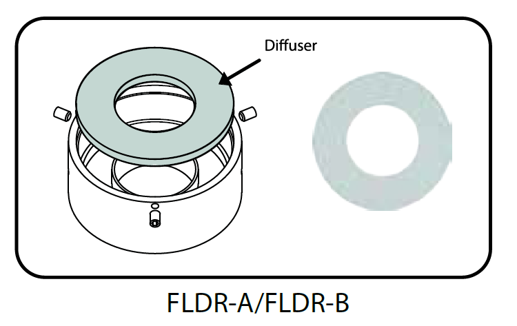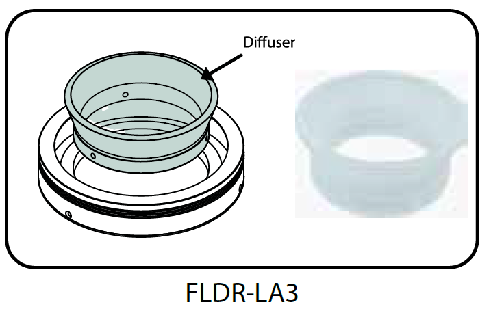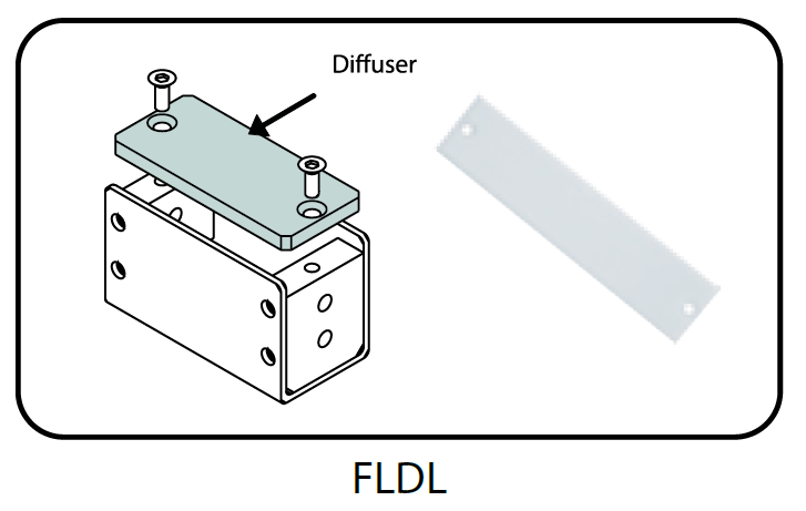 Diffusers are available as additional accessories for the series FLDR-A, FLDR-B, FLDR-LA3 and FLDL. The diffusers for the series FLDR-A, FLDR-LA3 and FLDL are fastened with screws by default; depending on housing shape, one adapter is needed for the FLDR-B series. Diffusers with adapters are referred to as a set. There are different levels with regard to diffuser properties: The levels are called 000 (clear),421 (diffuse) and 433 (very diffuse). Diffusers for the FLDR-LA3 series range from diffuse to very diffuse.