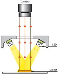 The LEDs are ring-shaped concentrated on the flexible board to mount the LEDs. This angled Ring light prevents shadowing and focuses the light at an angle to the centre of the illuminated object.