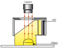 A half mirror aligns the high-intensity, even light from the LED array to the same optical axis as the lens.